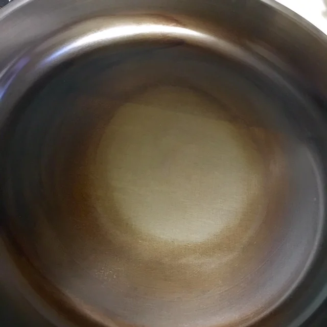 3. Turn the heat off and allow the pan to cool for a few minutes. This solidifies and strengthens your transformed hard polymerised oil. Repeat until: